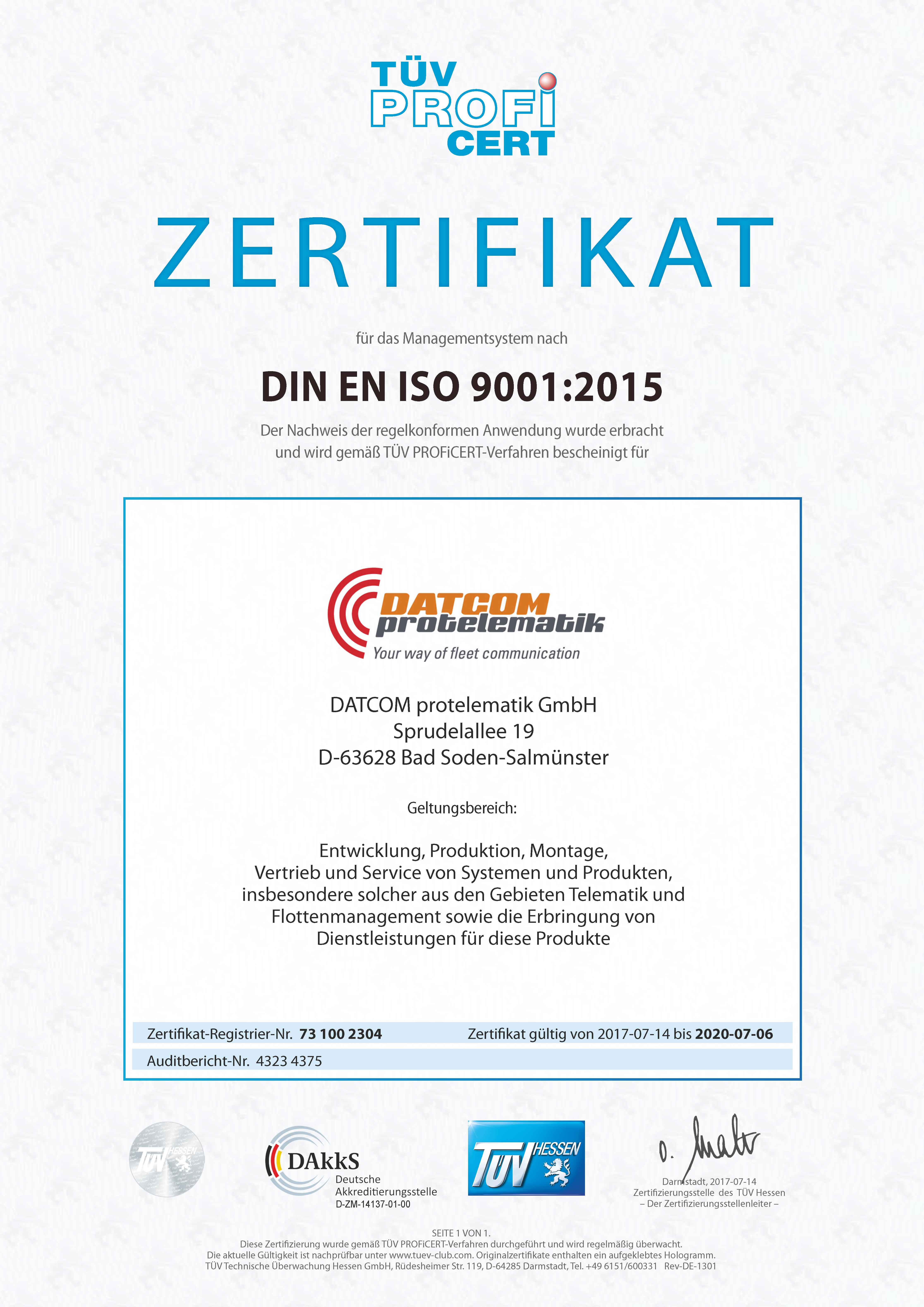 DATCOM protelematik GmbH seit Juli 2017 nach DIN EN ISO 9001:2015 zertifiziert