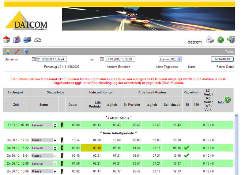 Über eine Gruppenstruktur werden alle Fahrzeuge, Objekte und Personen in einer Übersicht dargestellt. Positionen, Statusmeldungen, Trailer-IDs, Nachrichten, Aufträge, Fahrer-Informationen sowie Live Lenk- und Ruhezeiten stehen in Echtzeit zur Verfügung.